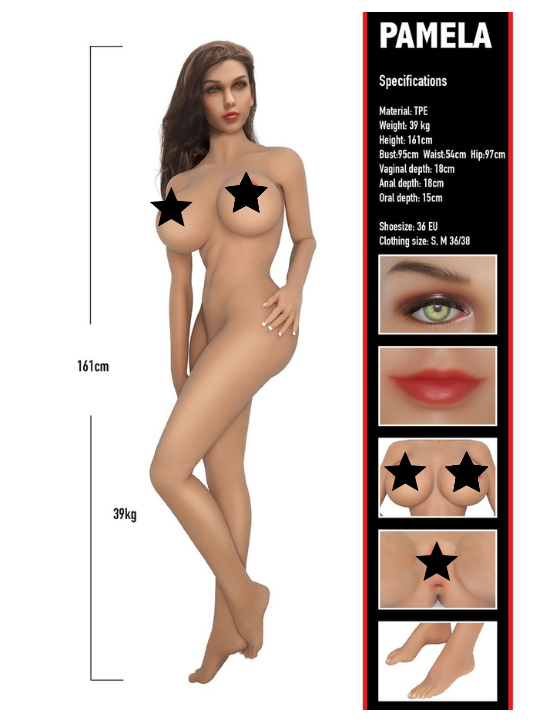 Specifikationer: Skostorlek: 36 (EU) | Klädstorlek: S, M - EU 36/38 | Byst: 95 cm | Midjemått: 54 cm | Höftmått: 97 cm. Pamela är en stor, livsliknande kärleksdocka tillverkad av premiummaterial som mjuk TPE. Designen har en robust stålskelett för maximal hållbarhet och fristående användning, samt flexibilitet för att posera dockan i önskad position. Varje Bangers Babes-dam har realistiska oral-, vaginal- och analtexturerade kanaler som kan värmas upp om så önskas. Andra naturtrogna detaljer inkluderar en kvalitetshårpiska, lösnaglar och delikata ansiktsdrag.